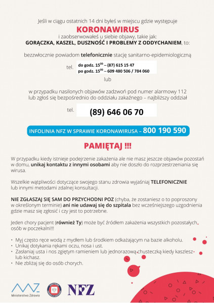 Wersja nieobowiązująca z dnia 06-03-2020 11:53:35 Drukuj WAŻNE INFORMACJE NA TEMAT POSTĘPOWANIA W PRZYPADKU PODEJRZENIA ZAKAŻENIA KORONAWIRUSEM. Załączniki _KV_plakat format: pdf, rozmiar: 876.76 KB, data dodania: 06-03-2020 11:52:22 Plakat format: pdf, rozmiar: 334.61 KB, data dodania: 06-03-2020 11:18:44 KV_400x272 format: pdf, rozmiar: 504.91 KB, data dodania: 06-03-2020 11:18:44 KV_174 format: pdf, rozmiar: 293.55 KB, data dodania: 06-03-2020 11:18:44 Wersja nieobowiązująca Strona może zawierać nieaktualną treść i załączniki. Możesz pozostać na tej stronie lub przejść na wersję z obowiązującą zawartością. Nie pokazuj ponownie Pozostań Przejdź do wersji obowiązującej