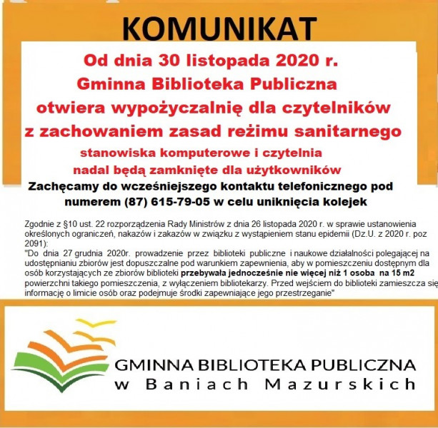 Komunikat Gminnej Biblioteki Publicznej w Baniach Mazurskich o otwarciu wypożyczalni dla czytelników.