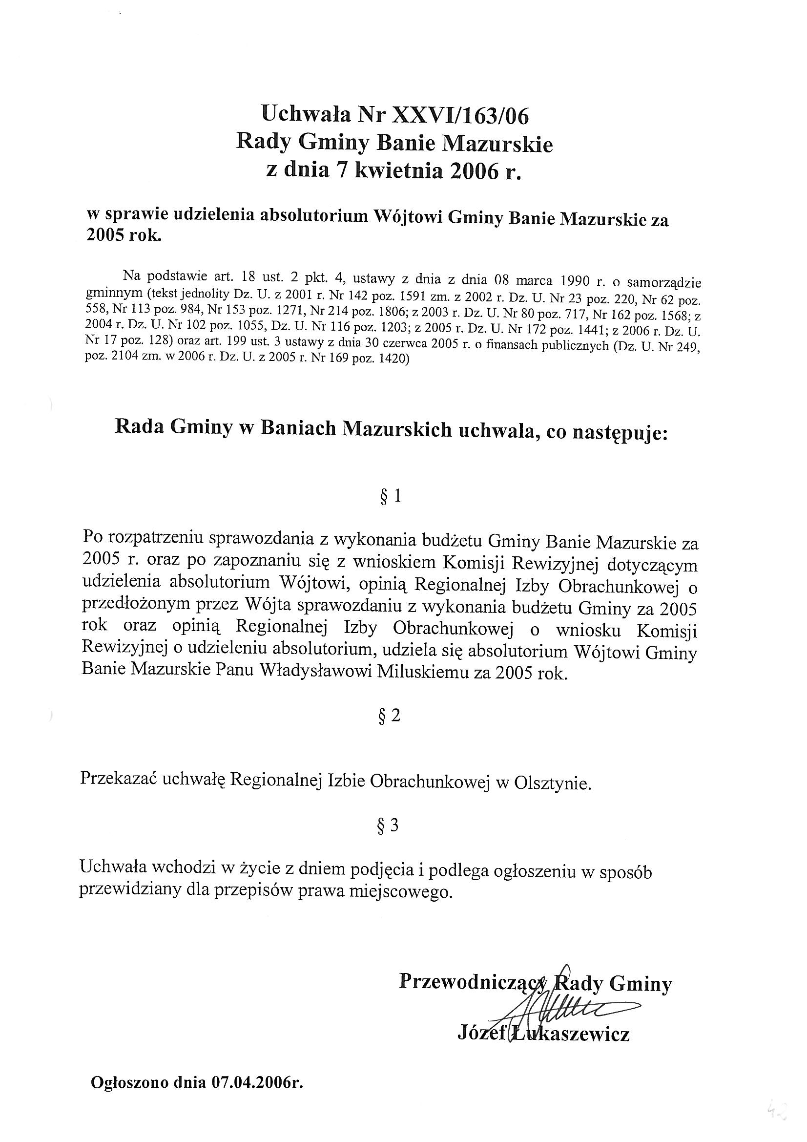 W sprawie udzielenia absolutorium Wójtowi Gminy Banie Mazurskie za 2005 rok .