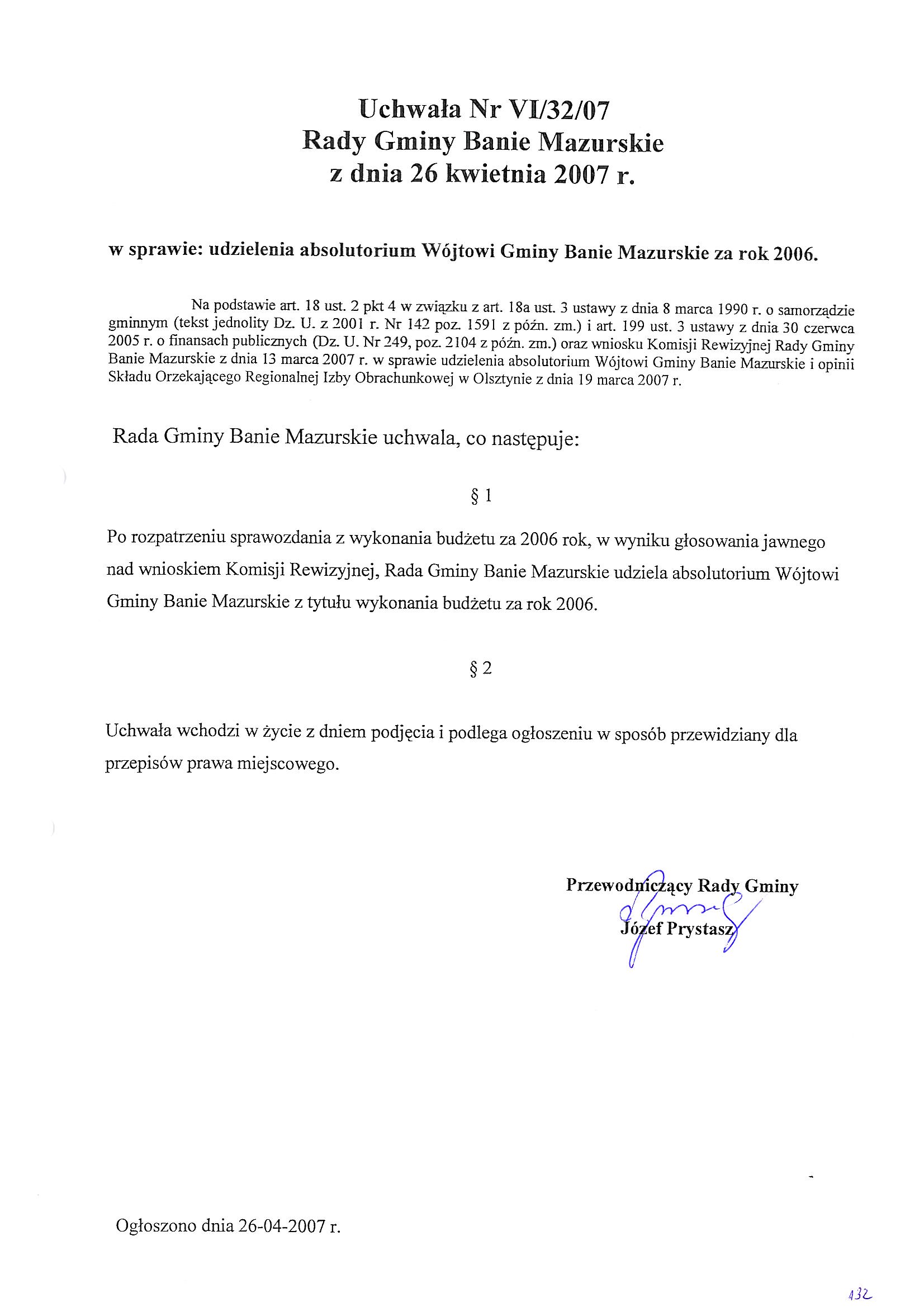 sprawie udzielenia absolutorium Wójtowi Gminy Banie Mazurskie za rok 2007