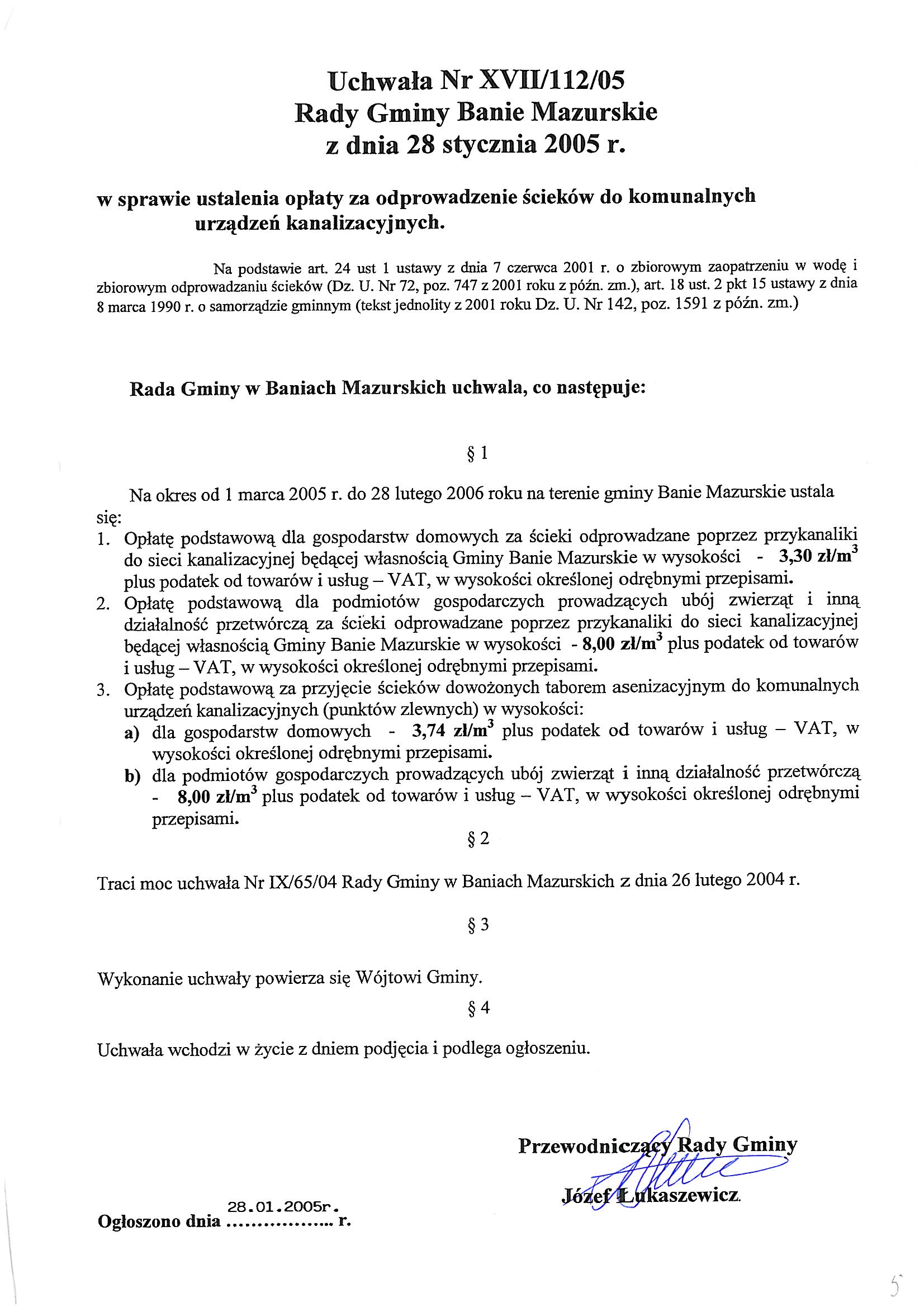 W sprawie ustalenia opłaty za odprowadzenie ścieków do komunalnych urządzeń kanalizacyjnych.