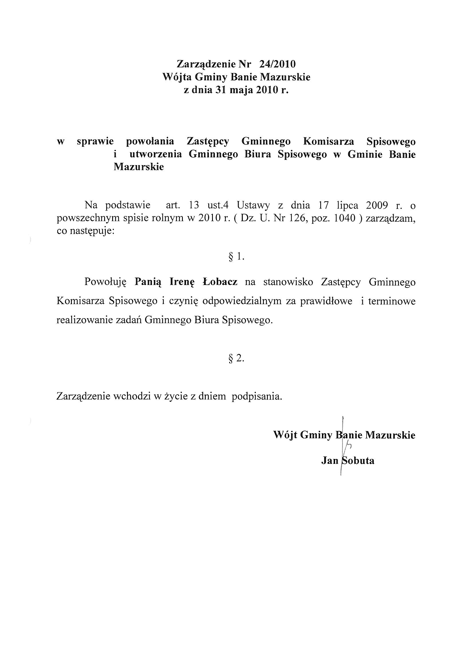 W sprawie powołania Zastępcy Gminnego Komisarza Spisowego i utworzenia Gminnego Biura Spisowego w Gminie Banie Mazurskie.