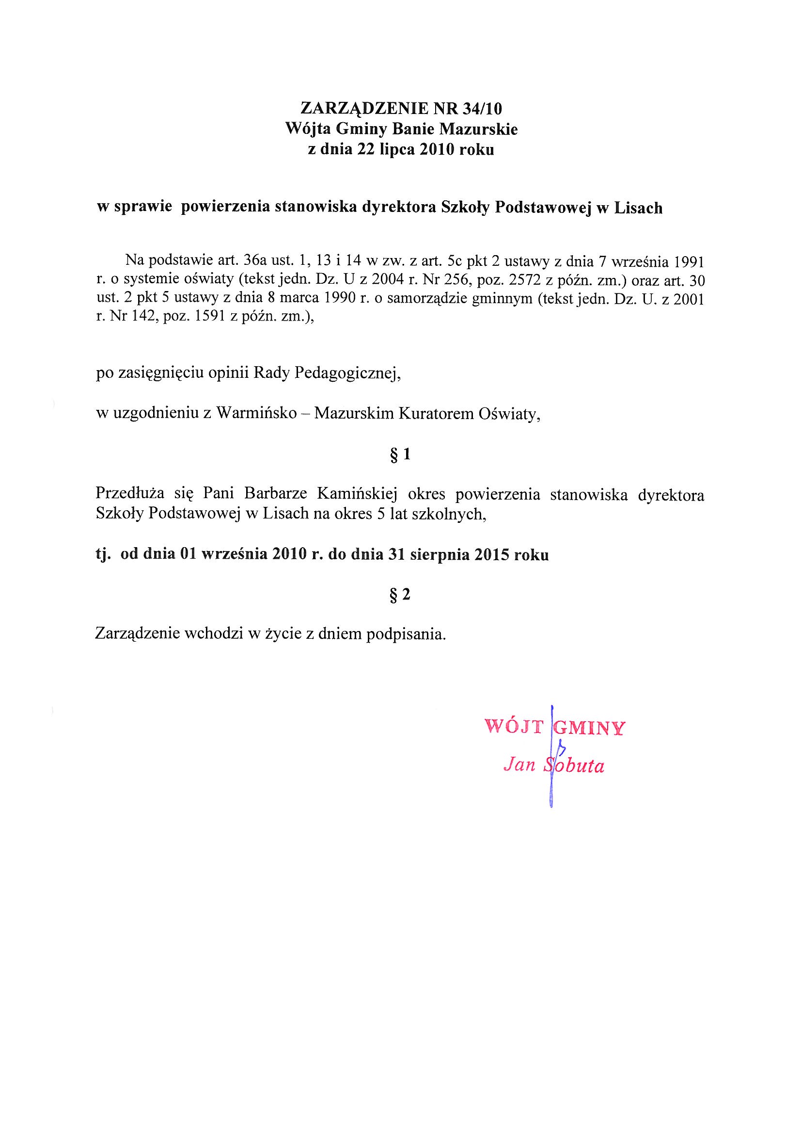 W sprawie powierzenia stanowiska dyrektora Szkoły Podstawowej w Lisach.