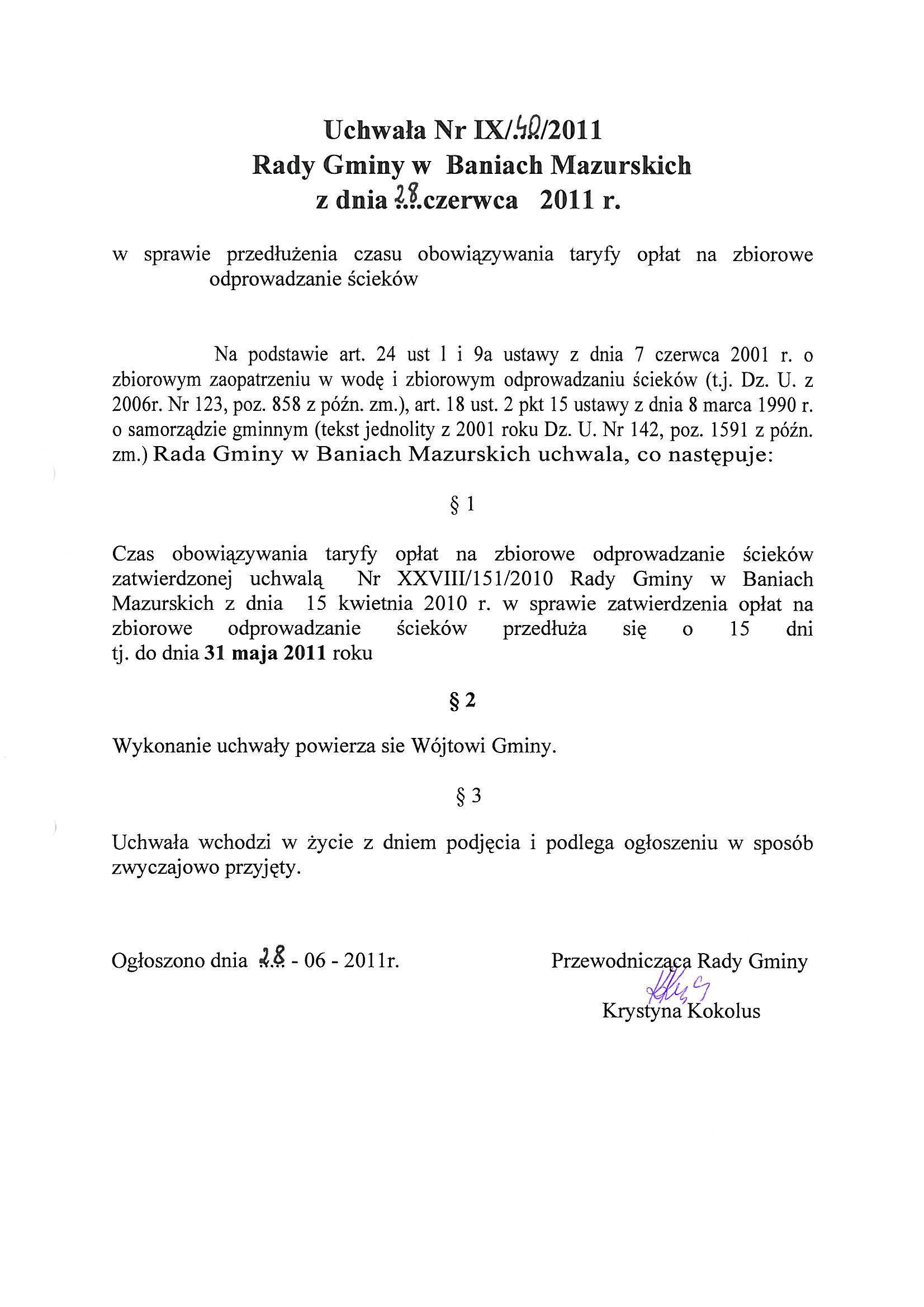 Wersja obowiązująca z dnia 06-07-2011 09:45:43 Drukuj przedłużenia czasu obowiązywania taryfy opłat na zbiorowe odprowadzanie ścieków Numer aktu IX/40/2011 Rodzaj aktu Uchwały Rady Gminy Data podjęcia 28-06-2011 Data wejścia w życie 2011-06-28 Status Uchwalony Zmienia XXVIII/151/2010 , XXVIII/151/2010 , XXVIII/151/2010 Załączniki Załączniki przedłużenia czasu obowiązywania taryfy opłat na zbiorowe odprowadzanie ścieków format: image/jpeg, rozmiar: 0.00 B, data dodania: 06-07-2011 09:44:54