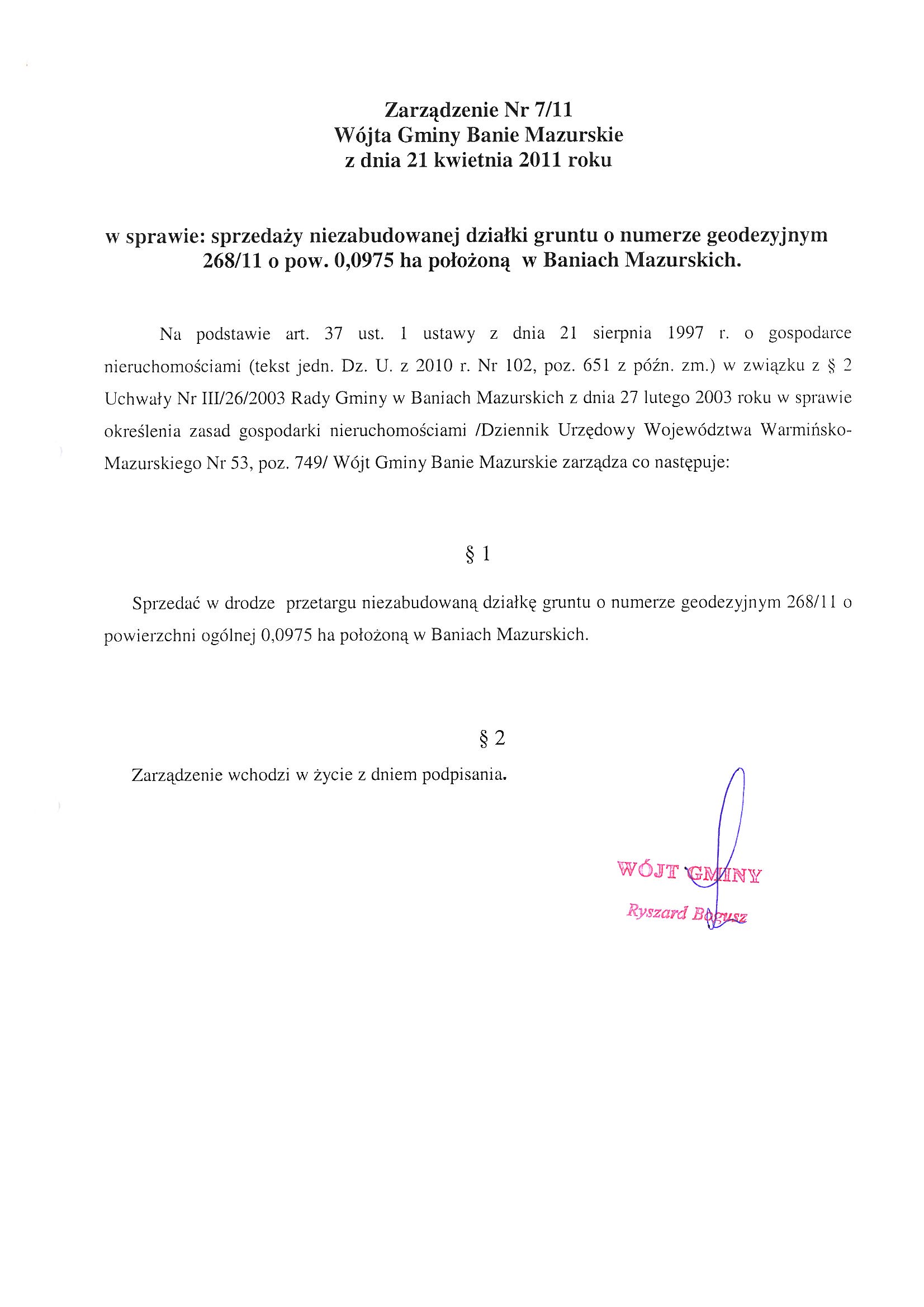 w sprawie sprzedaży niezabudowanej działki gruntu o numerze geodezyjnym 268/11 o pow. 0,0975 ha położoną w Baniach Mazurskich